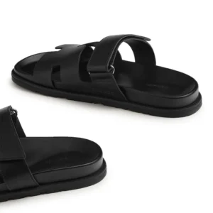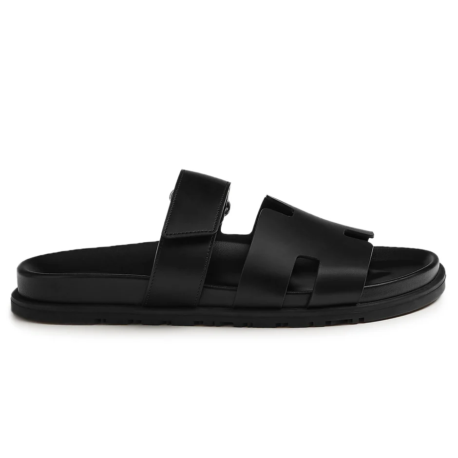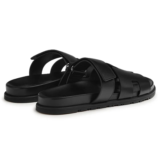 Step into understated luxury with the Hermes Chypre Sandals in Triple Black. Crafted with premium calfskin leather and designed for all-day comfort, these sandals feature the signature H cut-out and an adjustable Velcro strap for a tailored fit. The ultra-light rubber sole offers grip and flexibility, making them the perfect companion for elevated casual looks or summer escapes.