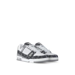 The iconic LV Trainer sneaker, originally designed by Virgil Abloh, is revisited this season in a combination of Monogram denim and Monogram-embossed grained calf leather. This model is characterized by its elaborately constructed upper and multiple signatures, including the LV Initials on the tongue and back, and Monogram Flowers on the technical rubber outsole.