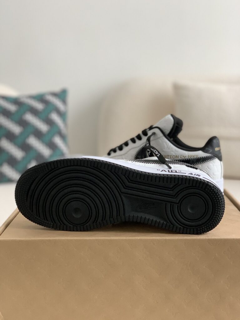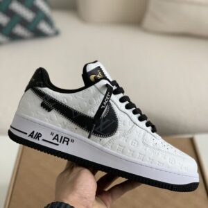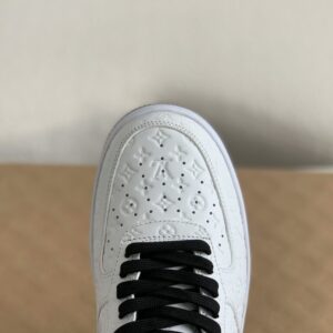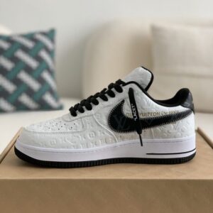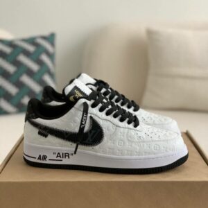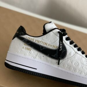 Imagine stepping out in these head-turning sneakers inspired by the legendary Louis Vuitton x Nike Air Force 1 Low collaboration. This striking white and black design seamlessly blends streetwear and high-fashion, featuring the signature Louis Vuitton monogram subtly embossed on the premium leather upper. Notice the meticulous craftsmanship in every detail, from the Off-White™️-inspired “LACET” tag and exposed stitching to the iconic “AIR” branding on the midsole. These sneakers offer a luxurious look and feel that will elevate your sneaker game to the next level.