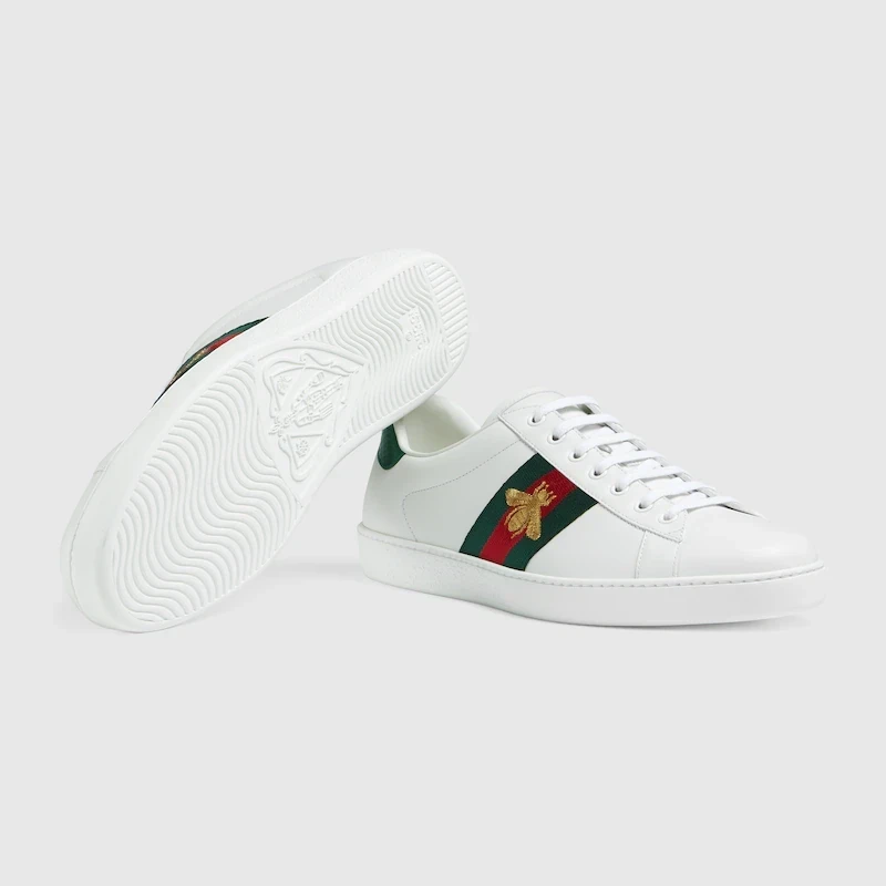 The Gucci Ace low-top sneaker in leather is embellished with the gold embroidered bee against the Web stripe. The bee is an archival code first introduced in Gucci ready-to-wear in the 1970s.