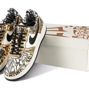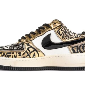 This rare pair is a 2009 collaboration between Nike and Undefeated in commemoration of the hit HBO television show Entourage. The Gold Fukijama Air Force 1 Low was the second shoe Undefeated and Nike designed in honor of the show. It was made in addition to the university blue – and less rare – Fukijama Air Force 1 featured in the same episode.