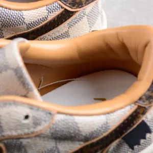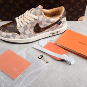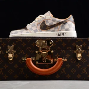 Step into iconic luxury with the Air Jordan 1 x Louis Vuitton Luxury Earth‑Tone Monogram Edition — a bold crossover of streetwear legend and high fashion artistry. Featuring rich burnt-orange suede overlays and full-grain leather panels dressed in the timeless Louis Vuitton monogram, this sneaker captures the spirit of couture rebellion. The matte-black Swoosh slices through the profile, while gold metallic accents on the heel add a flash of opulence. Black laces labeled “LACET” nod to Off-White influences, tying it all together. Grounded by a crisp white midsole and black outsole, this high-top masterpiece isn’t just footwear — it’s a statement of prestige, power, and elevated taste.