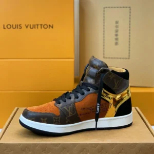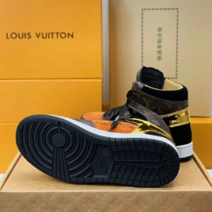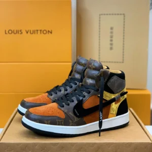 Step into iconic luxury with the Air Jordan 1 x Louis Vuitton Luxury Earth‑Tone Monogram Edition — a bold crossover of streetwear legend and high fashion artistry. Featuring rich burnt-orange suede overlays and full-grain leather panels dressed in the timeless Louis Vuitton monogram, this sneaker captures the spirit of couture rebellion. The matte-black Swoosh slices through the profile, while gold metallic accents on the heel add a flash of opulence. Black laces labeled “LACET” nod to Off-White influences, tying it all together. Grounded by a crisp white midsole and black outsole, this high-top masterpiece isn’t just footwear — it’s a statement of prestige, power, and elevated taste.