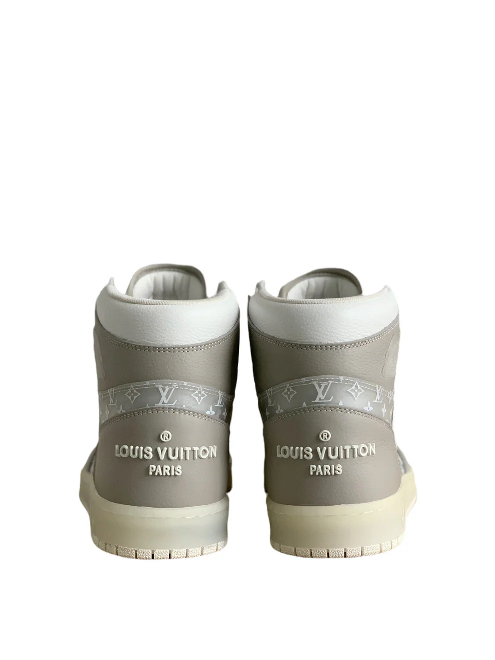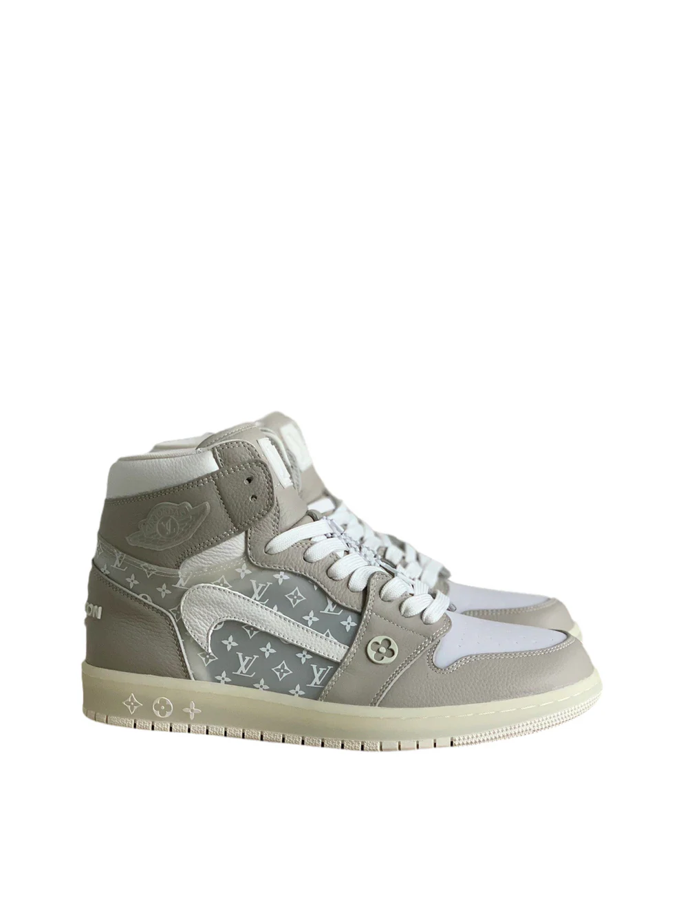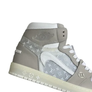 Step into understated luxury with the LV x Air Jordan 1 in Neutral Beige – a refined blend of iconic streetwear and high-end fashion. This premium sneaker features soft taupe-beige leather overlays, a translucent monogram Louis Vuitton canvas base, and a reversed white Swoosh for a bold yet elegant twist. The off-white sole and minimalist color palette make it a versatile piece that complements any outfit, from casual to upscale. Designed for those who appreciate subtle sophistication, this pair is the perfect expression of modern style and timeless appeal.