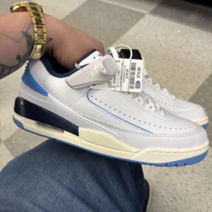 The Air Jordan 2 Retro Low ‘UNC’ is a tribute to Michael Jordan’s alma mater and features a color palette that fans will recognize. The white leather upper is highlighted by hits of University Blue on the interior lining, midfoot piping and molded heel tab, while the tongue is adorned with a blue Wings logo. The shoe’s white PU midsole has encapsulated Air-sole cushioning that delivers a comfortable ride while the two-tone rubber outsole provides additional support underfoot.