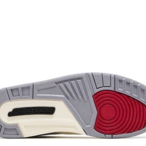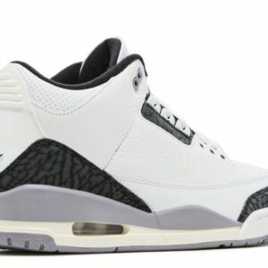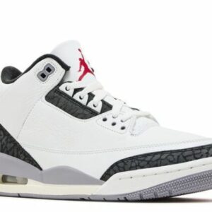 The Air Jordan 3 Retro ‘Cement Grey’ rocks white tumbled leather on the upper, accented with a dark grey elephant print on the eyestay and forefoot and heel overlay. A red Jumpman logo decortes the tongue and heel tab. The foam midsole partners with an encapsulated Air-sole forefoot unit and a visible Air bag heel unit for all-around cushioning.