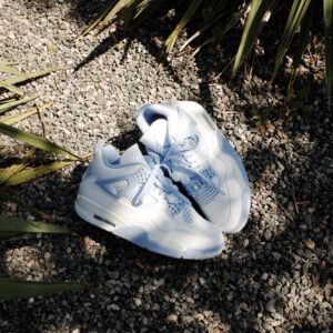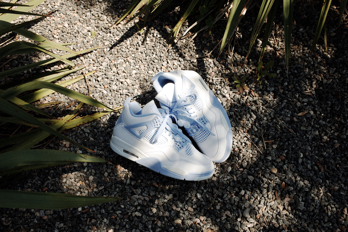 The Women’s Air Jordan 4 Retro ‘Forget Me Not’, also known as ‘Aluminum’, carries a white leather upper with contrasting powder blue touches on the collar lining, support wing, and molded back tab. A Jumpman emblem lands on the tongue tag, while a foam midsole works closely with an exposed Air-sole heel unit for a resilient feel.