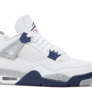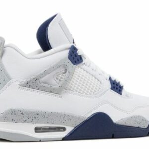 The AIr Jordan 4 Retro ‘Midnight Navy’ heavily borrows from the White/Cement OG colorway, including the grey paint splatter midsole and TPU wings. Midnight Navy hits on the lace loops, Jumpman logos and the midsole add a sharp contrast against the white leather upper. Other defining AJ4 details remain, including a visible Nike Air unit in the heel for cushioning and a modified herringbone traction pattern on the rubber outsole.