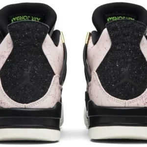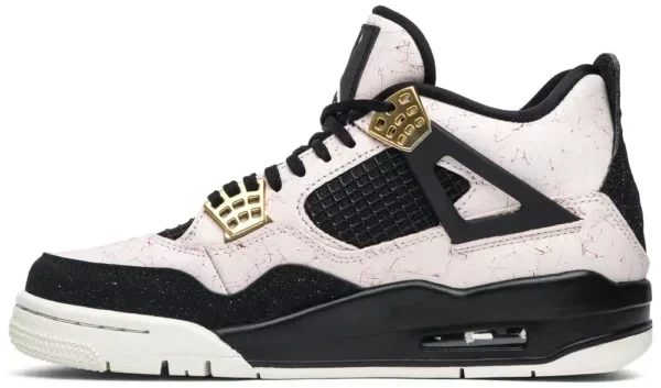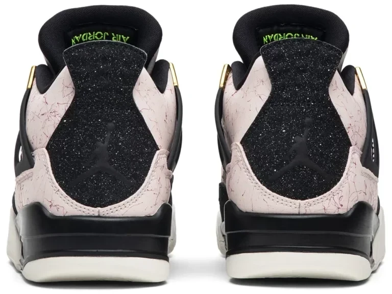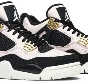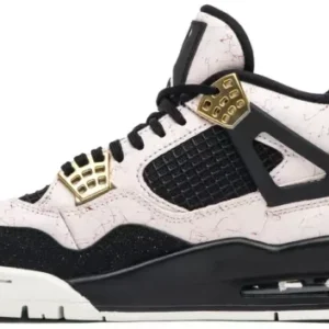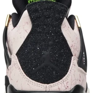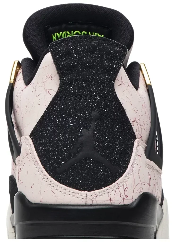 The Air Jordan 4 Retro ‘Splatter’ is a contrasting colorway. The shoe’s leather upper appears in Silt Red, accented by a splatter pattern throughout. Contrating black emerges on the mesh inserts and eyelet flange, with metallic gold eyelets accenting the design. Underfoot, Air in the midsole gives way to a Phantom midsole.