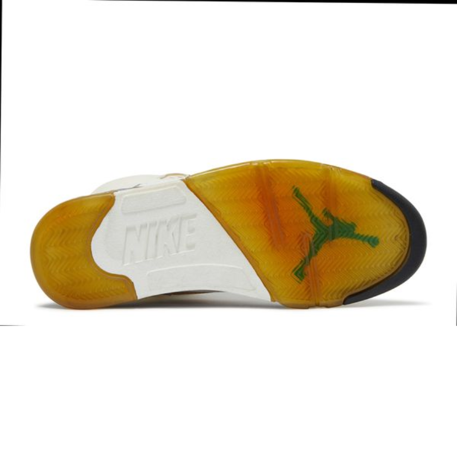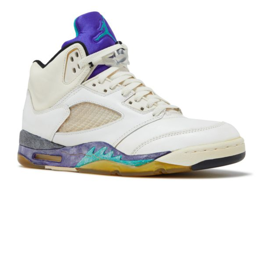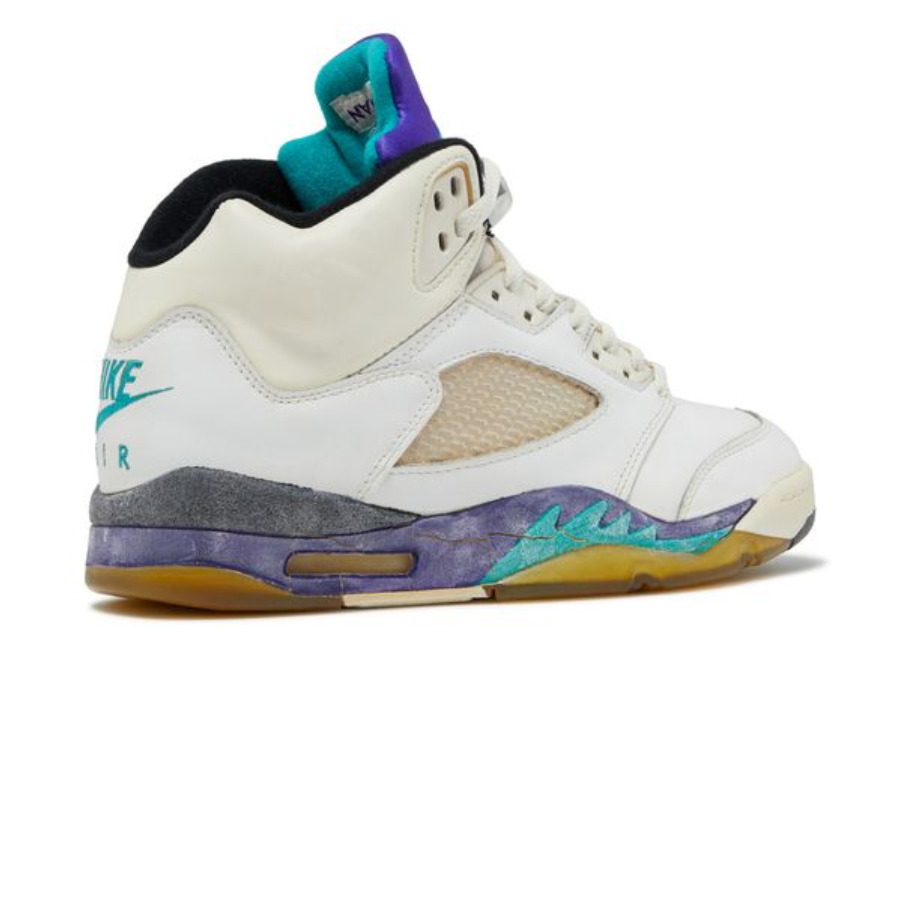The Air Jordan 5 OG ‘Grape’ dropped in 1990 as the one original colorway that doesn’t conform to the traditional Chicago-inspired color palette. Instead, the white leather upper is accented with a combination of Grape Ice and New Emerald on the tongue and midsole. An additional hit of teal is used on the embroidered Nike Air branding that adorns the heel.
