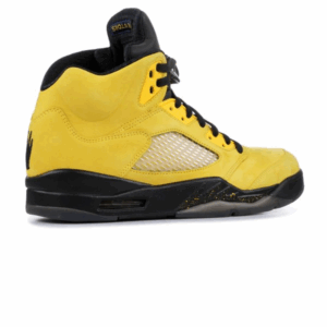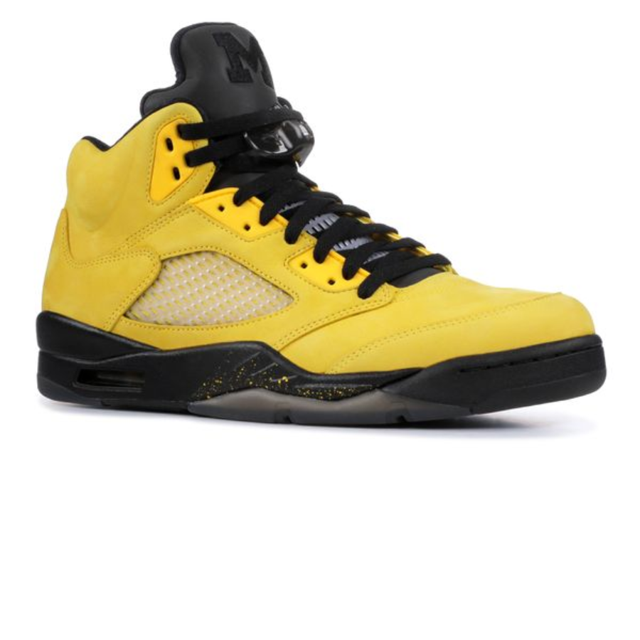 Tinker Hatfield and Dan Sunwoo collaborated to create the Air Jordan 5 Retro PE, a special edition sneaker that honors the legendary ‘Fab Five’ team from the University of Michigan in the ’90s. Consisting of Chris Webber, Jalen Rose, Juwan Howard, Jimmy King, and Ray Jackson, this iconic basketball team is celebrated through this highly desired Players Edition design. The shoe prominently showcases the distinctive Michigan team colors throughout its construction. Notable details include embroidered phrases ‘Hail To’ on the right tongue label and “The Victors” on the left, while the heels are adorned with the Fab Five hand gesture graphic logo.