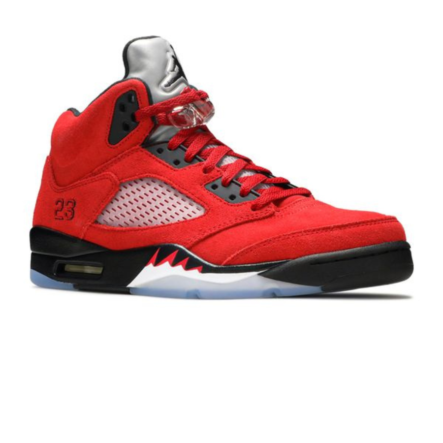 Originally released in 2009 as part of the two-shoe Raging Bulls pack, the Air Jordan 5 Retro ‘Raging Bull’ 2021 brings back one of those colorways with this April 2021 release. The shoe’s suede upper appears entirely in Varsity Red, contrasted by black eyelets and highlighted by a reflective silver tongue. Mesh inserts maintain the classic Jordan aesthetic, with a toggle lacing system securing the fit. Underfoot, the polyurethane midsole includes visible Air in the heel for cushioning, highlighted by the white and red shark-tooth detailing on the forefoot.