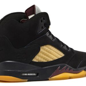 The A Ma Maniére x Air Jordan 5 Retro ‘Dusk’ is part of a two sneaker collaborative pack, with this version arriving in a black nubuck upper. An updated collar supplies a sleeker look, alongside pre-yellowed quarter panel netting featuring an interconnected series of A Ma Maniére’s distinctive ‘A’ logo. The rear heel displays tonal embroidered ‘Nike Air’ branding, while the silver reflective tongues showcase both Jumpman and A Ma Maniére branding. This sneaker rests atop a black PU midsole with shark-tooth detailing in a deep burgundy shade.