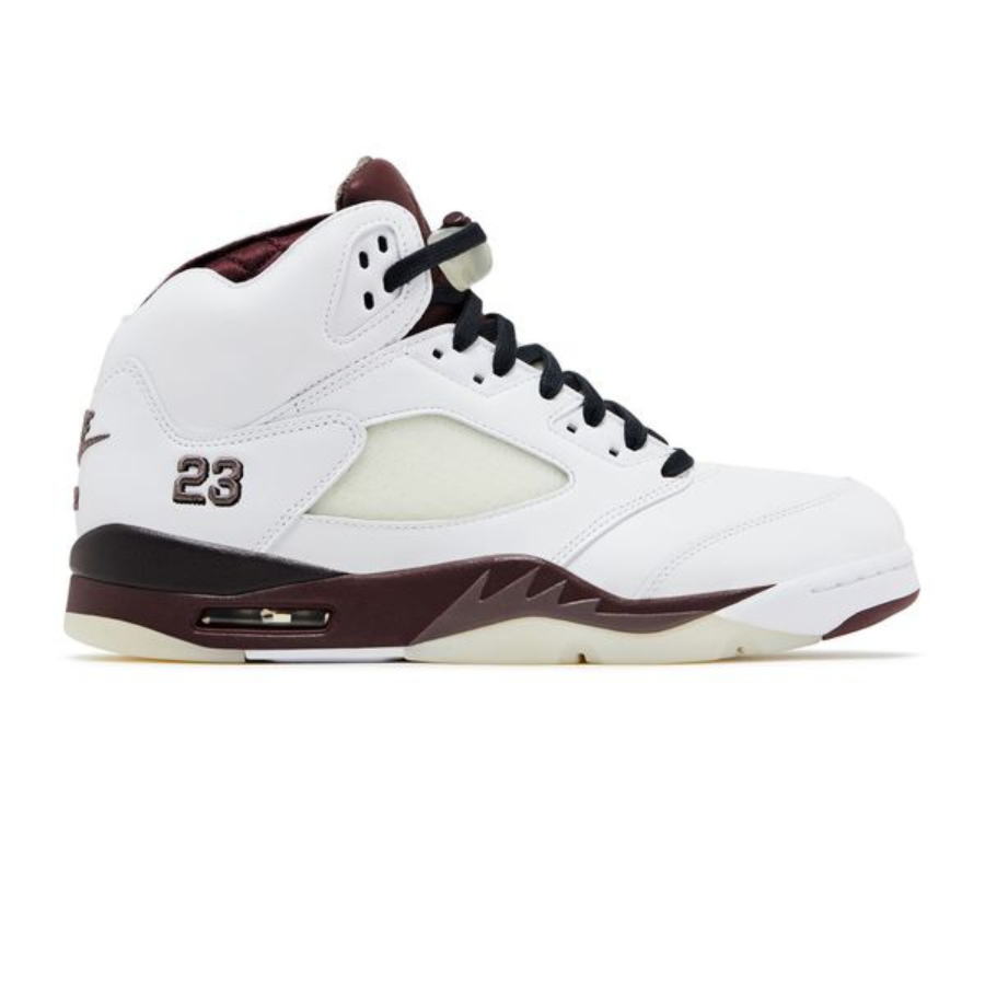 The A Ma Maniere x Air Jordan 5 ‘Violet Ore’ rocks a white leather upper with a pre-yellowed quarter panel netting and an embroidered ’23’ signoff. Rich quilted burgundy lines the interior, matching the Nike Air heel logo as well as the tongue. The latter has a Jumpman logo on the right shoe and A Ma Maniere’s ‘A’ emblem on the left. Another splash of burgundy occupies the midsole, accented with matching sharktooth details, complemented by an aged, see-through rubber outsole.