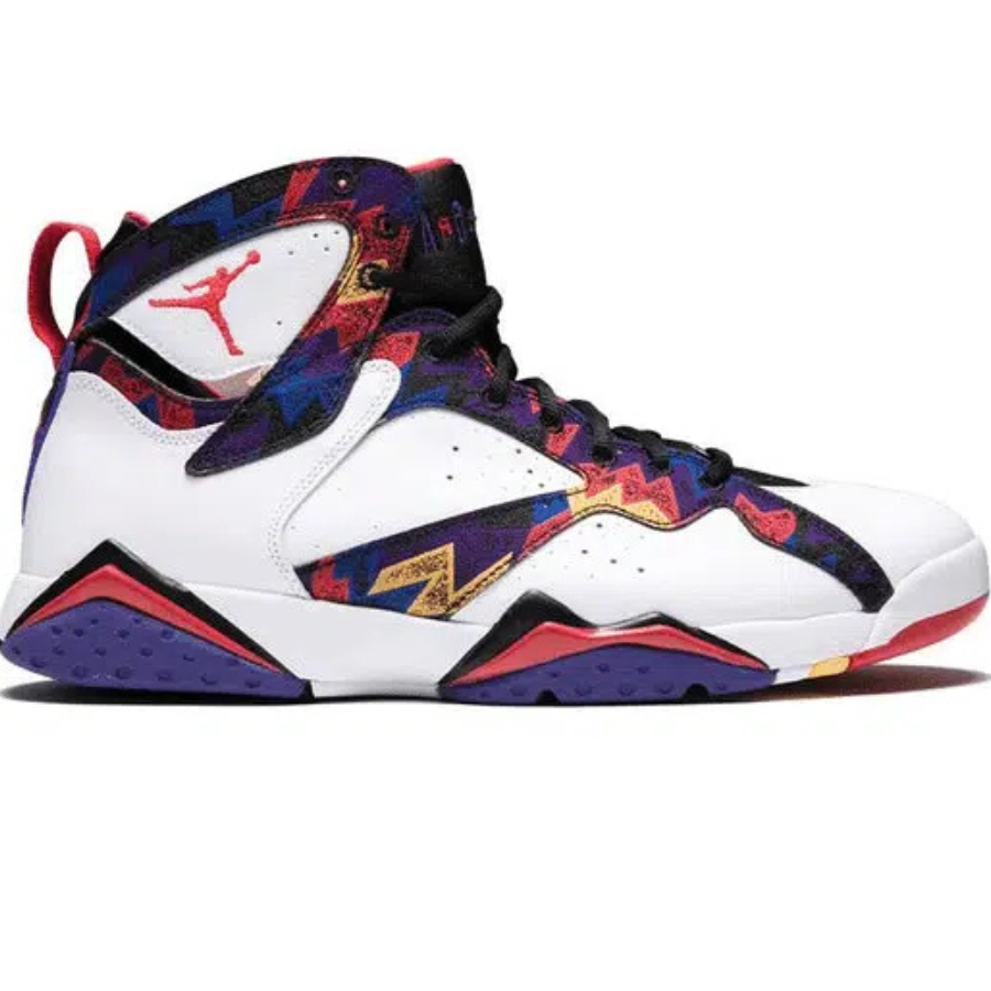 The Air Jordan 7 Retro ‘Sweater’ draws inspiration from an outfit worn by Michael Jordan at the 1992 Barcelona Summer Olympics and in a 1993 McDonald’s Super Bowl commercial with Larry Bird. Also known as the ‘Nothing But Net,’ the 2015 release combines a vibrant graphic design with upper white leather, black, University Red, and Bright Concord tongue, heel, and outsole accents.