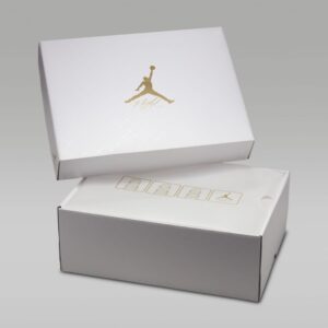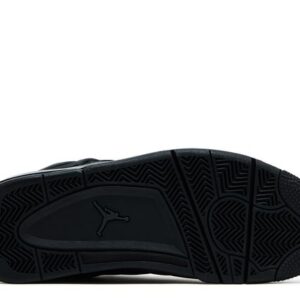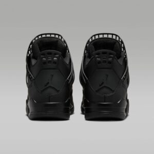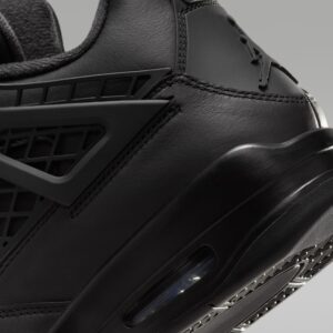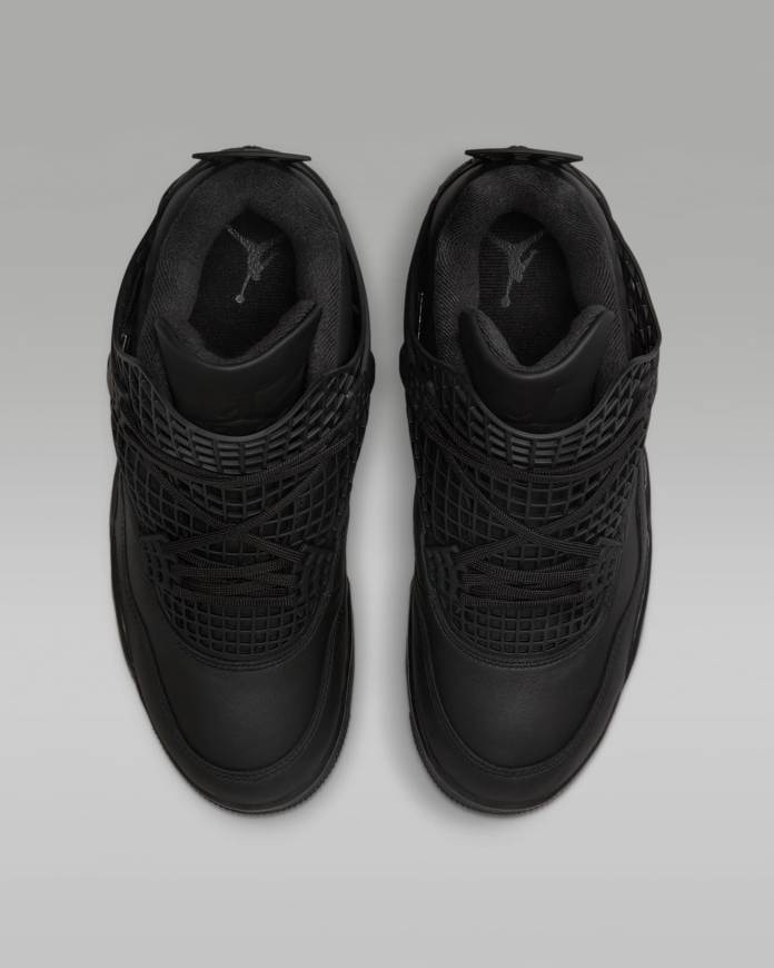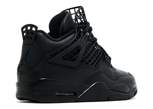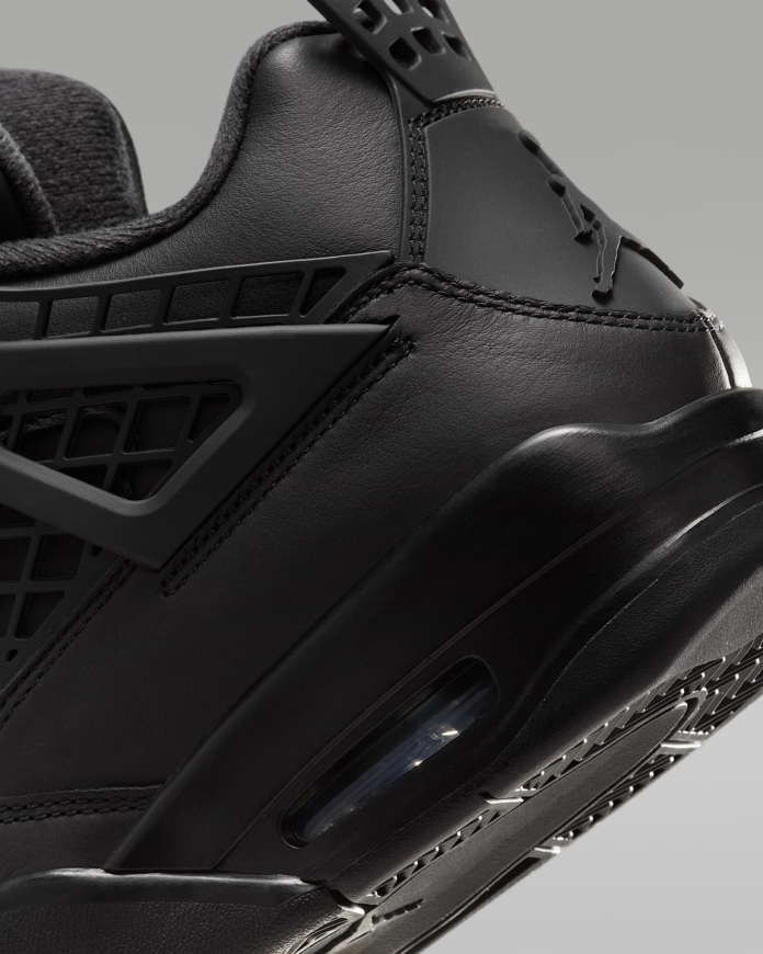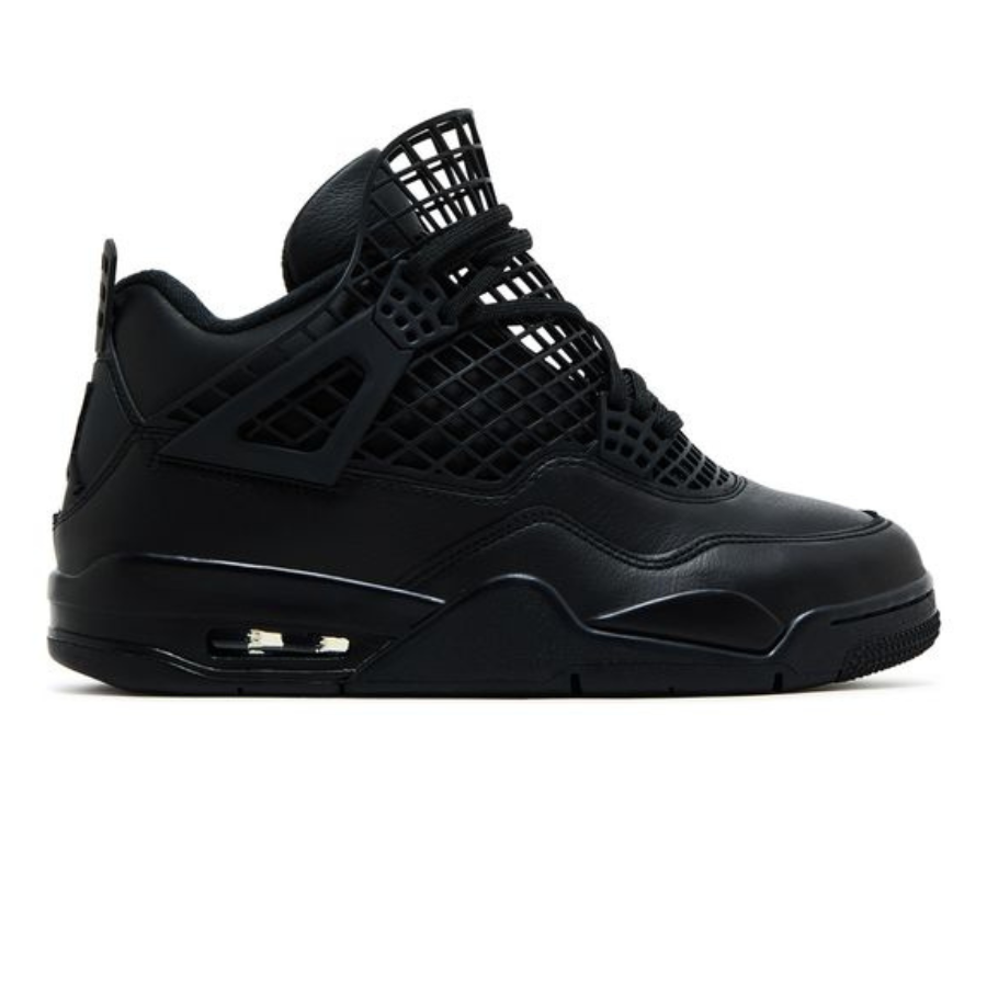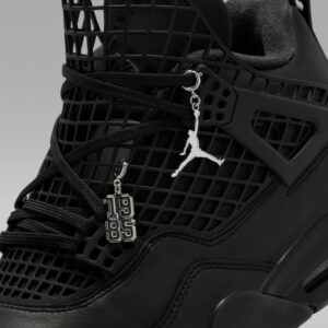 The Women’s Air Jordan 4 Retro ‘Net – Black’ has the laces fed through free-floating molded eyelets, securing a blackout leather upper that expands to the side panel netting so it wraps over the tongue. The Jumpman logo lands on the tongue and heel, which is ornamented with detachable silver charms. A matching black foam midsole contains a visible Nike Air bubble for cushioning.