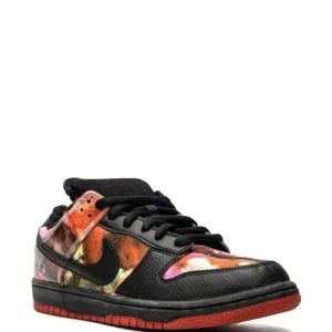 Released in 2005, this bold colourway of the Nike SB Dunk Low was designed by artist Pushead – known for his artwork on Metallica album covers and Thrasher tees. The pair is crafted from black leather, while the paint splatter print decorates the rest in red, pink, and green hues. Underneath, a rubber sole brings comfort to the design.