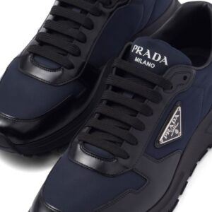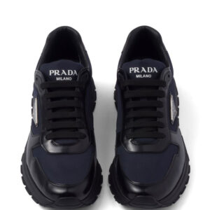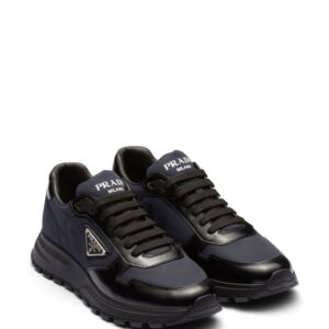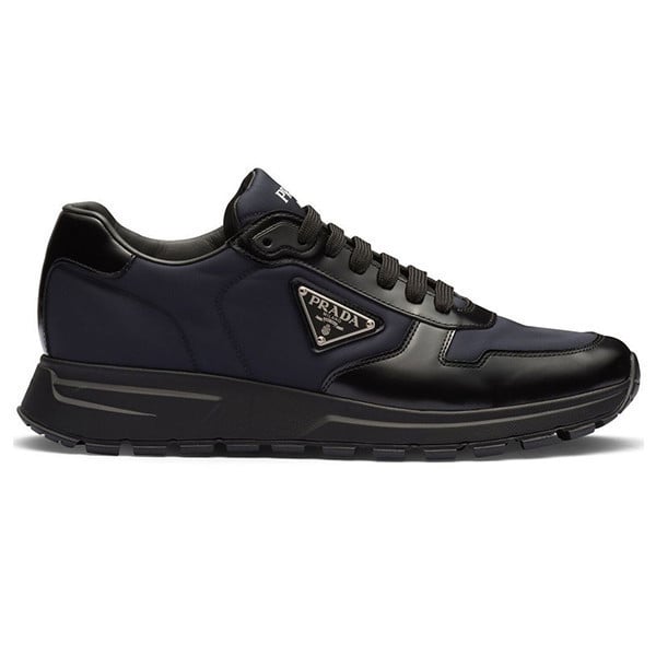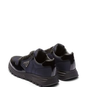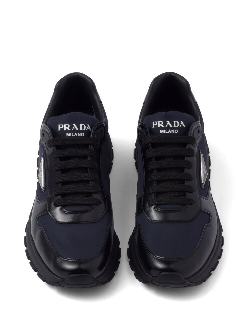 Prada incorporates signature branding into its designs. A case in point: this lace-up pair is emblazoned with the iconic triangle logo, a motif which first appeared in 1913 on trunks designed by Mario Prada.