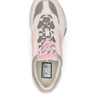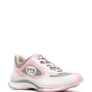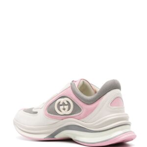 Gucci’s Run sneakers are a distinct branded take on retro running styles with their chunky wavy soles and interlocking G logos. They’re made from panels of grey mesh, pink suede and white rubber with colour coordinated laces.